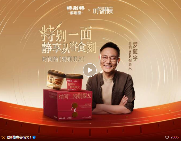 这步棋的深刻之处在于,它实现产品的“战略占位”。在消费者关于“时间”的思绪网络里,康师傅特别特鲜泡面通过罗振宇这个关键节点,成功地与“珍视时光”、“善待自己”等正面价值建立了强关联。这不仅大幅降低了用户的认知与信任门槛,更在竞争激烈的心智战场上,抢先占据了一个独特而有力的位置。它提示整个行业,在复杂的传播环境中,选择与品牌内核高度共振的“认知符号”进行深度合作,其构建信任、塑造价值的效率,往往远高于单纯的流量覆盖或高频曝光。