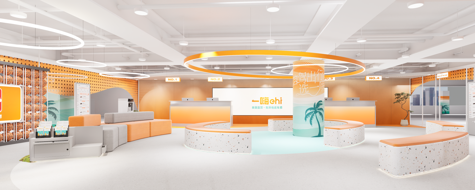 图:一嗨租车海口美兰机场T2航站楼店,环形开放空间融合海口独特的视觉印象