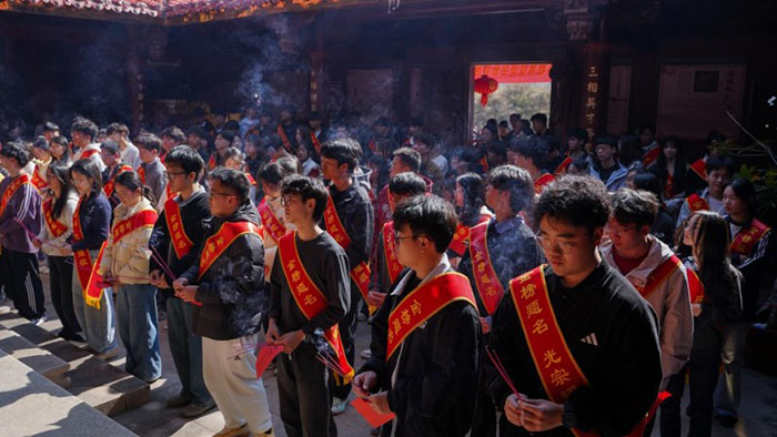 在传统文化传承环节,三洋圆通堂理事长杨连海组织优秀学子共同拜谒先祖。据史料记载,杨氏先祖于唐光启年间入闽,南唐时期肇基三洋,千年繁衍、枝繁叶茂。庄重的拜谒仪式,既是对家族根脉的深刻铭记,也是对优良家风的接力传承,引导广大学子在仪式中感悟感恩之心、恪守立身之道、厚植家国情怀。