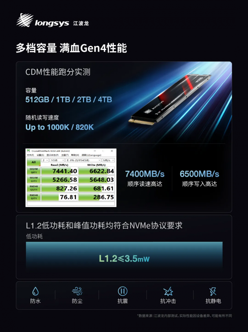 mSS作为江波龙推出的新一代高速存储介质,最大的亮点在于实现了体积的大幅压缩与读写速度的显著提升。相较于传统存储设备,mSSD通过Wafer级系统级封装(SIP),将主控、NAND闪存及PMIC等元件整合进单一封装体内,大幅减小了物理尺寸。在紧凑空间内,通过深度技术优化,其性能仍能满足PCle Gen4x4接口的高标准,读取速度最高可达7400MB/s、写入速度最高可达6500MB/s,4K随机读取速度最高可达1000K IOPS,4K随机写入速度最高可达820K IOPS,数据传输的效率与稳定并存。这一设计,使得mSSD为AI大模型加载、图像生成等高强度计算任务提供了坚实的性能支撑。