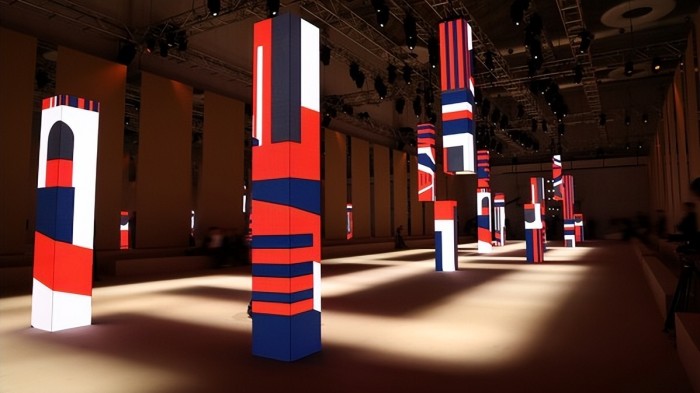 秀场设计以主题“流动的都市”为核心概念,秀道空间中多组动态视觉装置林立其中,高低起伏并错落有致,以变幻流转的几何色彩构型诠释米兰的都市生活节奏与多元风格美学。模特的行走轨迹、观众凝望的目光彼此交织,虚实相映之际,将“流动”从视觉隐喻转化为可被感知的空间韵律。行走其间,人与影像相互穿透,仿佛步入真实与想象交界的城市幻境,将每一刻都凝练为米兰城市脉搏的生动切片。