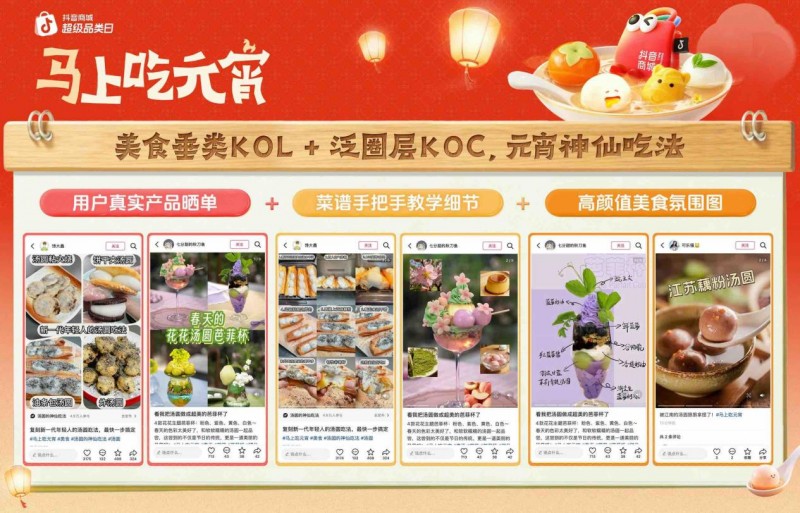 借助直播讲解、短视频展示、商城推荐等形式,一众过去深耕线下的品牌商家转至线上全方位呈现产品口感、工艺与特色,帮助消费者高效选购。在抖音站内,海量用户参与分享元宵猜灯谜、煮汤圆小技巧、南北特色民俗等主题的短视频内容,让消费者在了解产品的同时,感受浓厚节日氛围,进一步带动消费意愿,成为元宵消费爆发的重要助力。