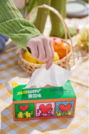 赛百味每年有4至5波新品上市,每一次上新,产品的“外衣”都会随之持续焕新,带来截然不同的审美体验。首批上市的“纸巾盒式包装盒”及全套系列包装,便披上了美国波普艺术大师凯斯·哈林经典的“心动涂鸦”画作。作为世界级的艺术图腾,凯斯·哈林作品中标志性的动感舒展的彩色小人、缀着翅膀的爱心,以极其跳跃的色彩和生动的形态,完美契合了春日万物复苏的律动。