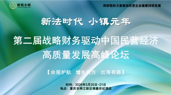 2026年3月20日至21日,备受瞩目的“第二届战略财务驱动中国民营经济高质量发展高峰论坛”将于中国·重庆盛大举行。本届论坛以“新法时代,小镇元年”为主题,聚焦十五五规划最新政策解读,以“合规护航、增长有方、出海有路”三大核心价值,汇聚政、产、学、研、商各界权威力量,为正处于变革深水区的民营企业与财税服务机构提供一套打破周期的战略罗盘与实战地图。