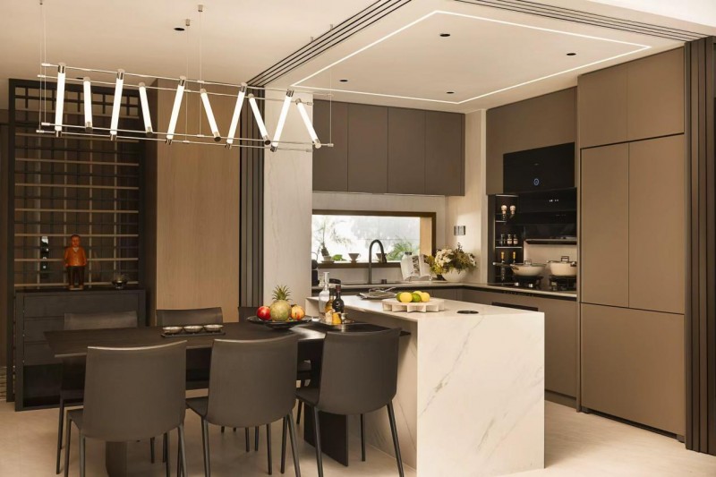 社交厨房,对应热爱社交的精致中产,核心诉求是“烹饪与社交的无缝衔接”。“高级感”成为空间的语言——极致简约的线条、隐藏式集成设计,让厨电与橱柜融为一体;轻料理与热炒分区操作,让女主人可以一边准备沙拉一边和朋友聊天。