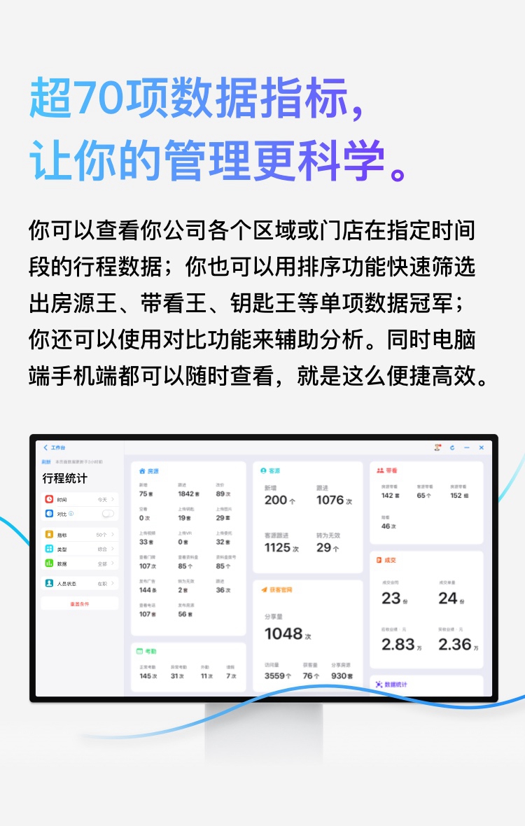 智能决策辅助:自动生成带看转化率、房源热度排行、房产经纪人业绩排行等数据报表,辅助管理层制定精准营销策略。