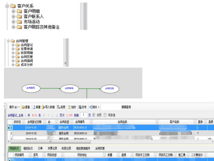 合同管理模块则充分体现了勤哲Excel服务器平台的数据关联与统计优势。合同录入系统后需经过审批流程并自动归档,同时系统能够关联项目执行情况、订单信息、开票记录及收款记录。通过平台的数据统计功能,管理人员可以实时掌握未开票金额与未回款合同金额,使合同管理与资金管理更加清晰高效。