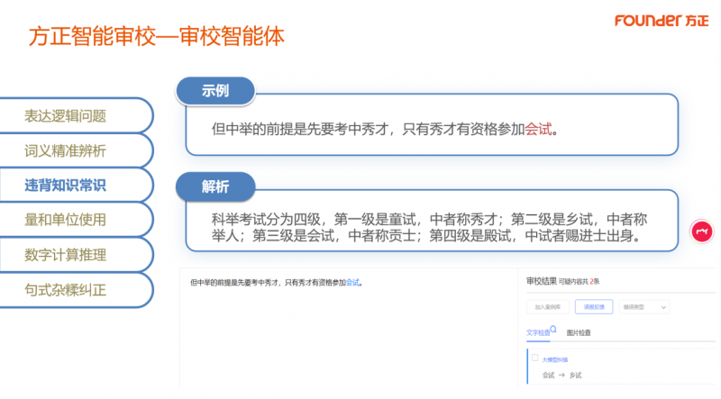 相较于通用大模型存在的“幻觉”、过度润色、准确性难以保证等问题,方正审校智能体立足于专业语料库,聚焦出版专业需求,不仅可以完成基础的敏感内容检查,更能深入开展表达逻辑审校、词义精准辨析、违背知识常识排查、量和单位规范使用、数字计算推理验证、句式杂糅纠正等深层次编校工作,识别精准、解析专业,有效释放编辑生产力,使编辑可以从繁琐的文字校对工作中抽身,专注于内容深层价值的挖掘。