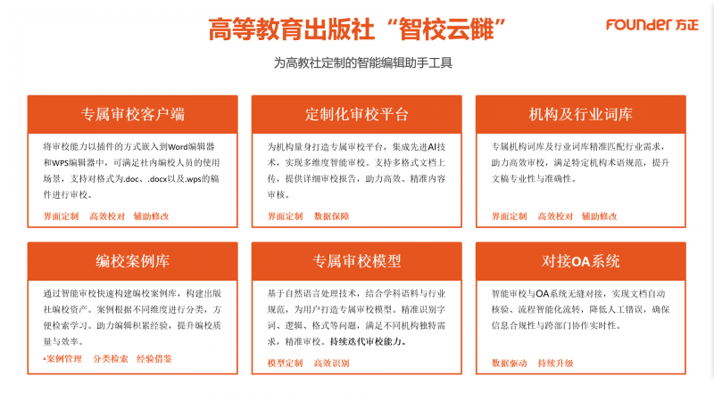 方正电子数智技术已在多家出版单位落地应用。与高等教育出版社合作的“智校云雠”平台,深度融合智能技术与高等教育出版审校专业需求,通过搭建定制化审校平台、构建机构及行业词库与编校案例库、研发定制化审校模型,不仅提升了高教社内容审校效率与质量,更为高等教育出版领域审校智能化发展提供了可复制、可推广的实践经验。