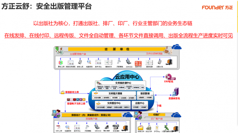 方正云舒安全出版管理平台聚焦出版痛点,以出版社为核心,打通出版社、排版厂、印刷厂和行业主管部门的业务生态链,通过在线发排、远程传版、文件全自动管理,实现出版全流程生产进度的实时可视。同时,平台以技术手段筑牢“安全”与“精准”双重防线:全自动文件属性信息检查,可及时发现文件名、尺寸、出血等潜在风险;全自动文件规范性检查,从源头避免乱码、缺字、缺图等导致的印刷质量事故;智能比对功能可快速识别定稿文件与修改稿的差异,大幅提升校对效率;独有的内核处理器支持全自动格式转换,完美还原排版效果,解决生僻字丢失、字体效果缺失等行业难题。