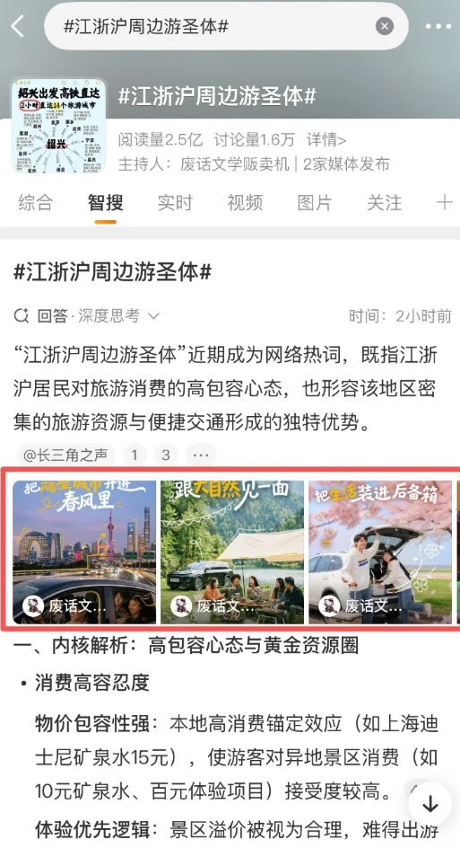 微博话题“江浙沪周边游圣体”和“之前的游客照简直就是乱拍”在没有大规模流量投放的情况下,凭借自然流量相继登上微博热搜总榜+生活榜,累计阅读量突破5亿,讨论量过万。两个话题的共同点在于剥离了品牌直接诉求,转向对用户出行心理的捕捉,在用户讨论中自然延伸到对更好出行方式的思考。