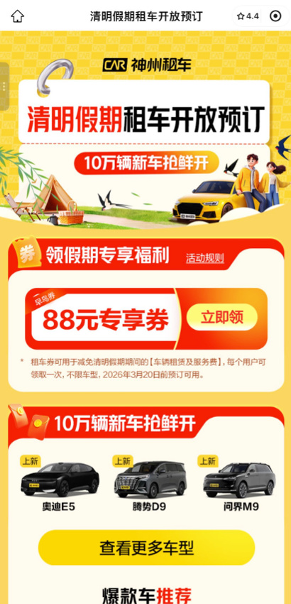 单纯的情绪营销若缺乏业务支撑,极易流于空洞。神州租车通过扎实的基建能力,为感性的情绪提供了理性的降落点。神州租车推出了多项业务权益配合营销落地:10万辆新车投放市场,覆盖奥迪E5、腾势D9、问界M9等热门车型,从源头解决用户对车辆异味和车况的顾虑;春日18元特价租车的优惠活动和0 押金租车降低出行门槛;针对清明假期推出88元专项租车券,进一步激发用户预订意愿。