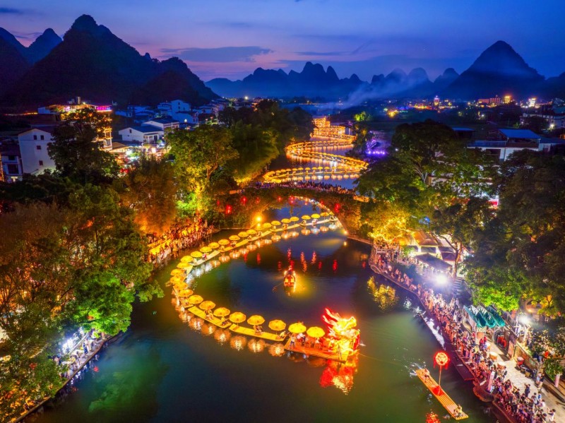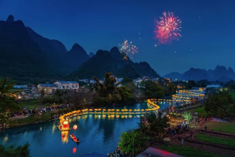 夜色下阳朔遇龙河上“金龙”与烟花交相辉映