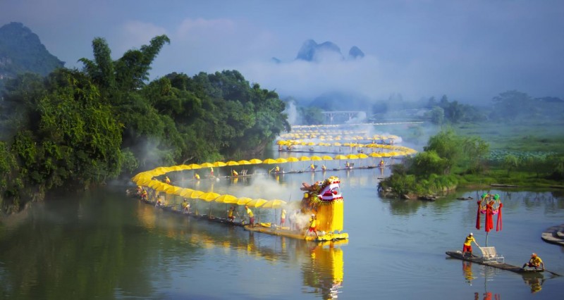 非遗“金龙”在阳朔遇龙河上巡游