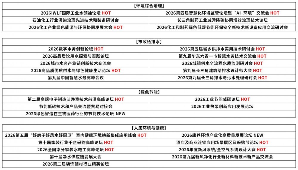 《中华人民共和国生态环境法典》正式发布、“建设零碳工厂和园区”写进“十五五”规划建议、“固废十条”重磅出炉、“人工智能+”行动全面提速……顶层设计协同发力,为绿色低碳转型协同增效注入强劲动能。2026世环会同期,近百场行业高峰论坛蓄势待发,将云集近千位政策制定者、学术泰斗与产业领袖,紧扣“十五五”开局关键命题,从多维视角解开发展迷局,找准新航向,节能双碳、工业污废水、城镇供排水、环境监测、废气治理、园区绿色发展、化工制药、新能源、直饮水、净水供应链、康养环境、适老化改造、隐蔽工程美学、大宅机电、存量房改造等全覆盖。这不仅是思想的碰撞、资源的链接,更是人脉拓展、开展合作的起点。