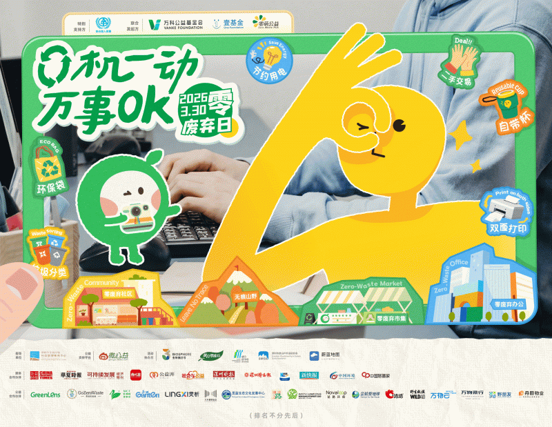 2026年3月30日,第九届零废弃日暨第四届国际零废物日如期举行。本届活动由万科公益基金会、壹基金与零萌公益联合发起,并获联合国人居署中国办公室特别支持。活动延续“‘零’机一动,万事OK”的主题,倡导公众从日常生活中的微小行动出发,践行“减量(Reduce)、复用(Reuse)、循环(Recycle)”的3R原则,通过多方协同搭建参与平台,将零废弃理念转化为公众可理解、可参与、可持续实践的具体路径。
