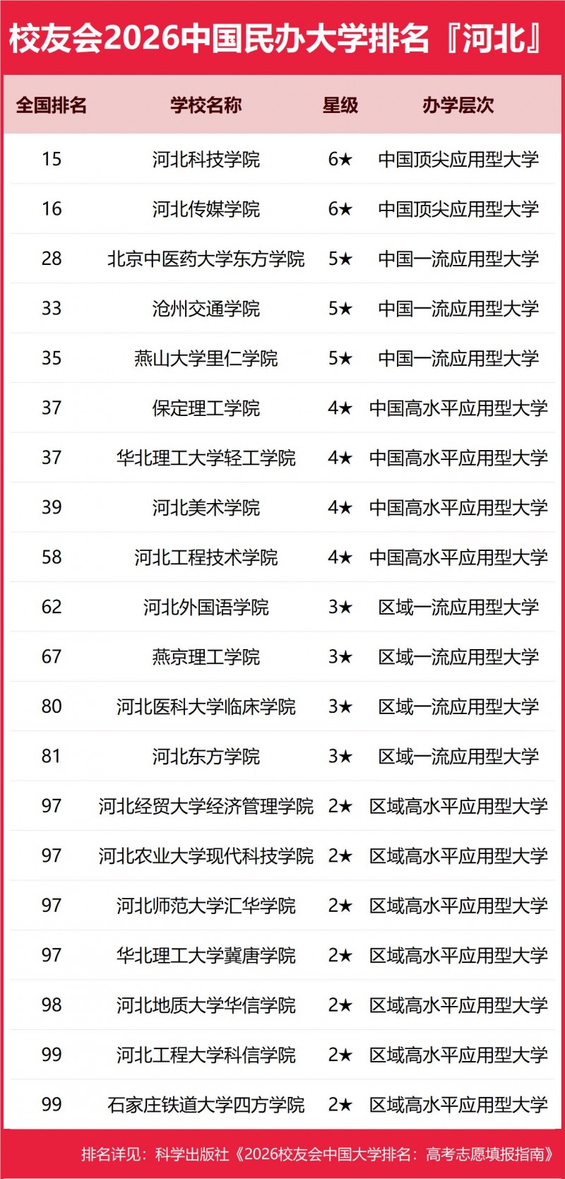 据了解,艾瑞深校友会网《2026年中国民办大学排名(Ⅰ类)》正式发布,河北科技学院凭借强劲综合实力再创佳绩,位列全国民办大学第15名,成功跻身全国三十强,同时继续稳居河北省民办高校首位。这一亮眼成绩,是学校办学水平、人才培养质量与社会影响力的集中体现,更标志着学校在高水平应用型大学建设道路上实现新跨越。