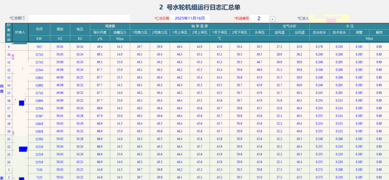 勤哲Excel服务器支持对水电站电气系统与水轮机组的小时级实时监控,全面记录运行状态。平台可自动生成电气运行日志和水轮机组运行日志汇总表,实现长期趋势分析与数据对比。汛期发电量数据可自动登记与汇总,为发电调度和汛期管理提供精准数据支撑,确保发电效率与安全运行同步保障。通过勤哲Excel服务器的公式联动与自动报表功能,管理人员无需手工整理数据,即可快速获取运行情况,提升监控精度与管理效率。