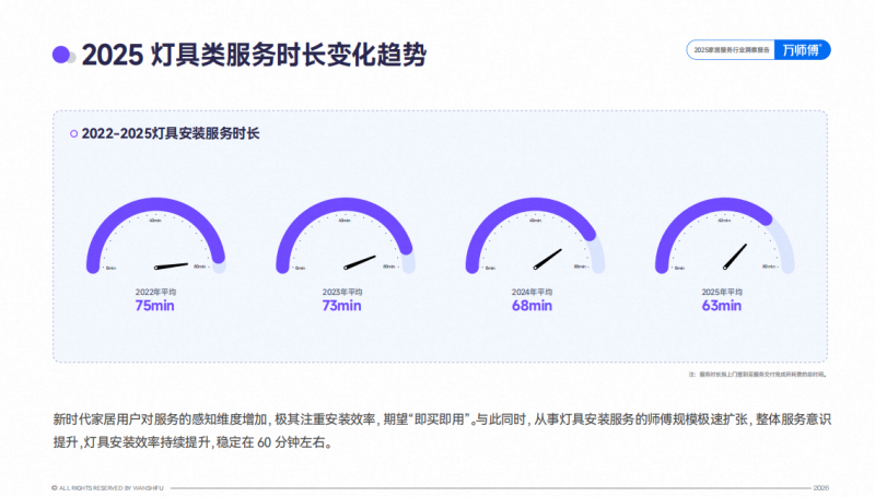 与此同时,从事灯具安装服务的师傅规模极速扩张,整体服务意识提升,灯具安装效率持续提升,稳定在60分钟左右。当今家居用户对服务的感知维度增加,极其注重安装效率,期望“即买即用”。
