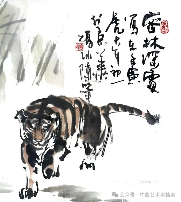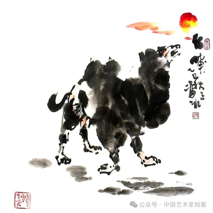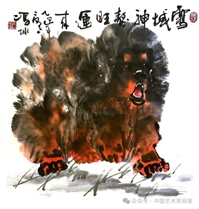 他在大写意的传统中挥毫,是中国水墨画中最具原始力量,最不可逆转的方式,每一笔落下都无可收回,每一丝迟疑皆无处遁形。冯冰所传导的,正是古代画家推崇的气韵生动:精神穿透物质时那活生生的共鸣。他笔下的藏獒,不是在绢帛上静止地摆姿。它们在蓄势。它们在散发气场。它们以顶级掠食者统摄整片领地的方式攫住观者的目光。那种静止,不是平静,而是蛰伏的力量。