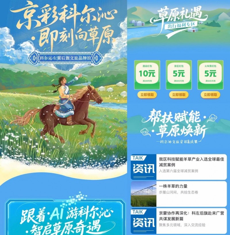 草原的浪漫,是骑马追风的自由。AI为你规划“晨雾中的牧场”小众路线,叠加满200减10元的酒店红包、满50减5元的景区与火车票红包,降低出行成本,连烤全羊都更香了!“帮扶赋能·草原焕新——科尔沁文旅资讯&成果”展示京蒙协作的成果:从生态保护到非遗传承,从旅游设施升级到特色产品开发,每一处变化都凝聚着协作的力量。