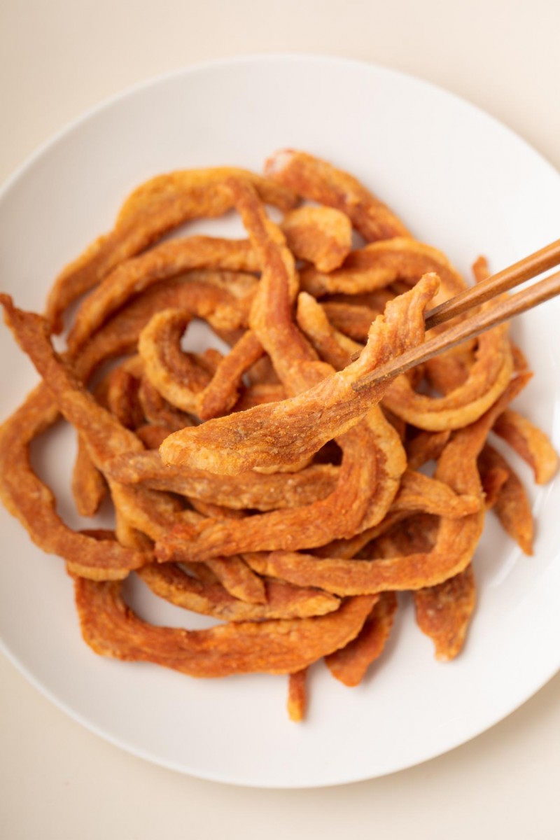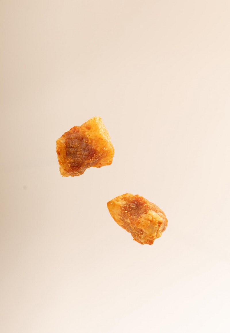 优选优质五花肉,经深度脱脂脱油工艺处理,酥脆双绝,肥肉部分清爽不油,瘦肉部分紧实入味,独立小巧,食用便捷,口感层次丰富。