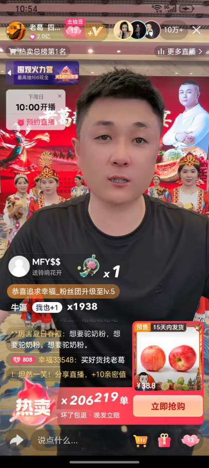 “昆玉市的红枣皮薄肉多,剪开看看,这肉质……”在为期两天的专场直播活动中,老葛、李龙在直播间内,聚焦新疆优质农特产品,通过流量赋能,精准对接,推动新疆好物走向全国市场。活动从上午10时至凌晨2时,直播间还推出试吃、发券、秒杀、满减等优惠活动,最终实现线上销售总额(GMV)超1.12亿元,成功达成预期目标。其中新疆好物阿克苏苹果,当天订单超13万,销量超100万斤。