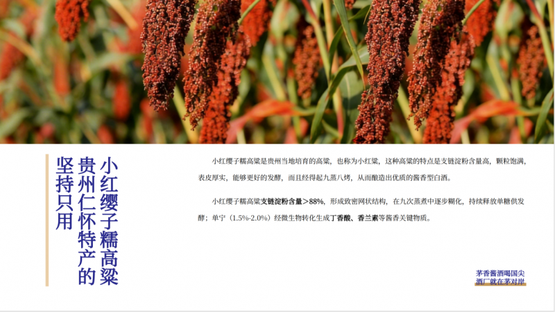 品牌甄选茅台镇本地红缨子糯高粱为核心酿酒原料,该品种高粱颗粒饱满、皮厚质坚、支链淀粉含量高,耐得住多轮次蒸煮与发酵,能充分释放风味物质,是酿造坤沙酱酒的最优原料;搭配优质冬小麦制作高温大曲,为发酵提供充足的微生物菌群,奠定酒体丰富的风味层次。