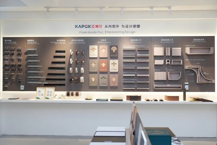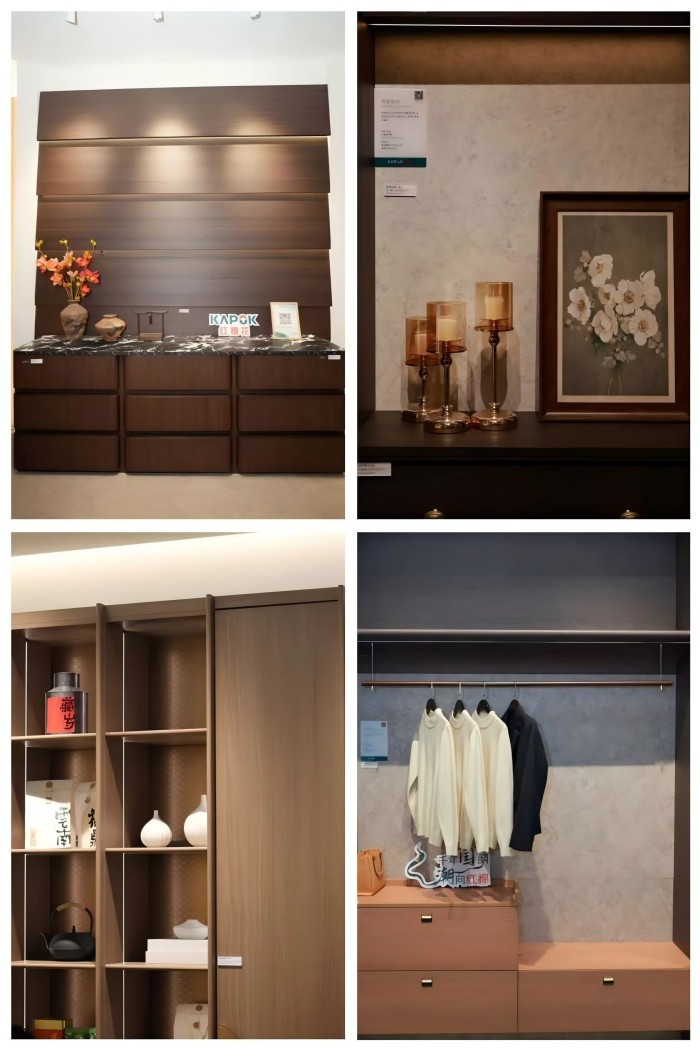每一组空间,都是红棉花门墙柜一体化能力的生动注脚。红棉花与封边条、圆弧、层板线条、五金等配套辅料无缝配合,让参观者直观感受到从材料到空间的完整转化。
