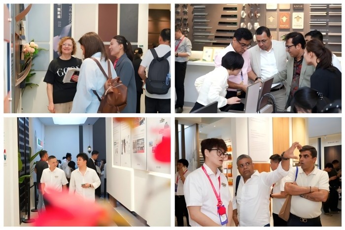 开展首日,红棉花展位便迎来人流高峰。来自印度、埃及、韩国等多个国家和地区的海外客商络绎不绝,他们驻足于展品前仔细观摩,对红棉花板材的工艺细节与环保性能表现出浓厚兴趣,现场洽谈气氛热烈。与此同时,行业协会代表等也到展位参观,深入了解红棉花从基材到成品的全产业链布局。齐全的材料矩阵、完善的配套体系,赢得社会各界的高度评价。