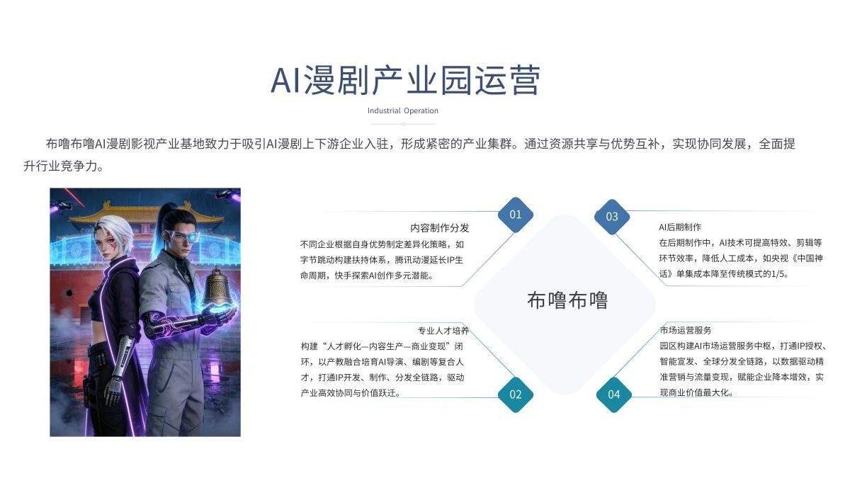 依托政策赋能,布噜布噜构建起涵盖AI漫剧承制、生产系统研发、IP孵化、全域发行、版权交易及产业园运营的完整业务体系,形成“技术研发+内容生产+产业集聚+商业变现”的全链条模式,彰显突出优势。