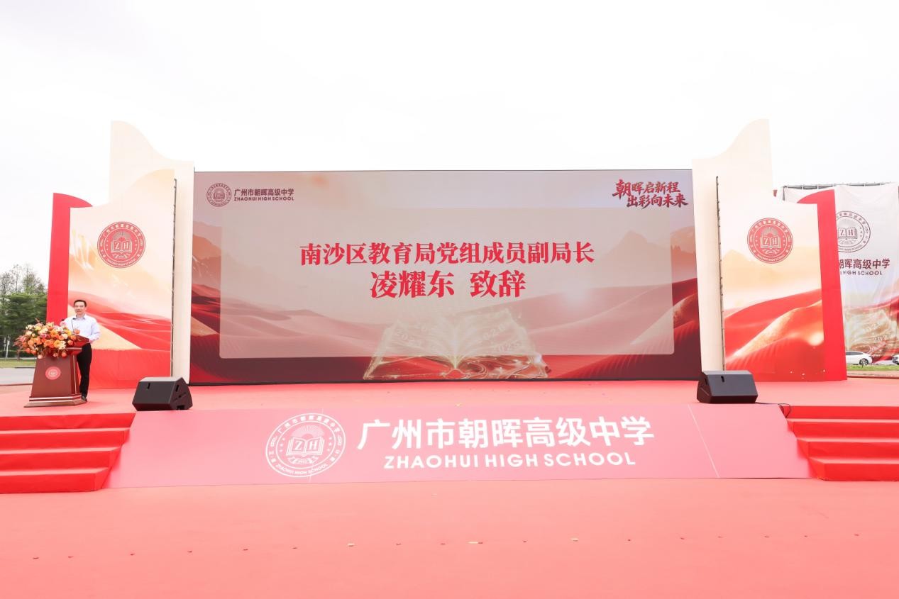 南沙区教育局副局长凌耀东代表区教育局致辞,对广州市朝晖高级中学揭牌更名表示热烈祝贺。他指出,南沙始终坚持教育优先发展战略,持续优化教育布局,朝晖高级中学的全新启航,是南沙民办教育提质增效的重要成果。他对学校未来发展寄予厚望,希望学校深耕内涵、彰显特色,全体教师潜心育人、匠心执教,广大学子勤学奋进、逐梦成长,区教育局也将全力支持学校发展,助力学校打造区域教育标杆。