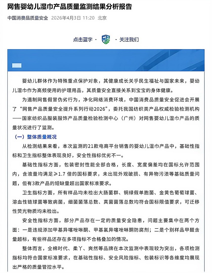 随着母婴护理精细化理念的普及,婴幼儿湿巾已成为万千家庭的刚需消耗品,筑牢品质安全防线尤为重要。就在近日,中国消费品质量安全促进会(简称“中消会”)发布了《网售婴幼儿湿巾产品质量监测结果分析报告》,其委托权威检测机构——国家纺织品服装服饰产品质量检验检测中心(广州),对21款电商平台热销婴幼儿湿巾进行专项检测。结果显示,样品基础性指标和卫生指标整体表现良好,安全性指标优劣不一;全棉时代、柔丫、爽然等品牌表现较为突出,各项检测指标均符合国家标准要求,在基础性指标、安全性指标、包装标识等各维度均展现出严格的质量管控水平。