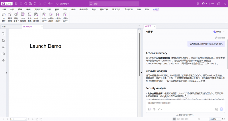 PDF操作检查器:新版本AI助手可自动扫描文档,识别潜在危险操作(如自动执行外部命令、可疑触发器等),并提供通俗易懂的风险说明,帮助用户在打开或分发前做出明智判断。