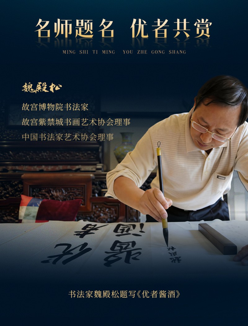 更令人动容的是,品牌邀请了被誉为“故宫走出的书法名片”的殿堂级艺术家——魏殿松亲笔题写“优者酱酒”。 魏殿松用其标志性的馆阁体,为产品注入了跨越艺术与酒文化的东方美学底蕴。一瓶酒,尚未开启,已是墨宝可藏。