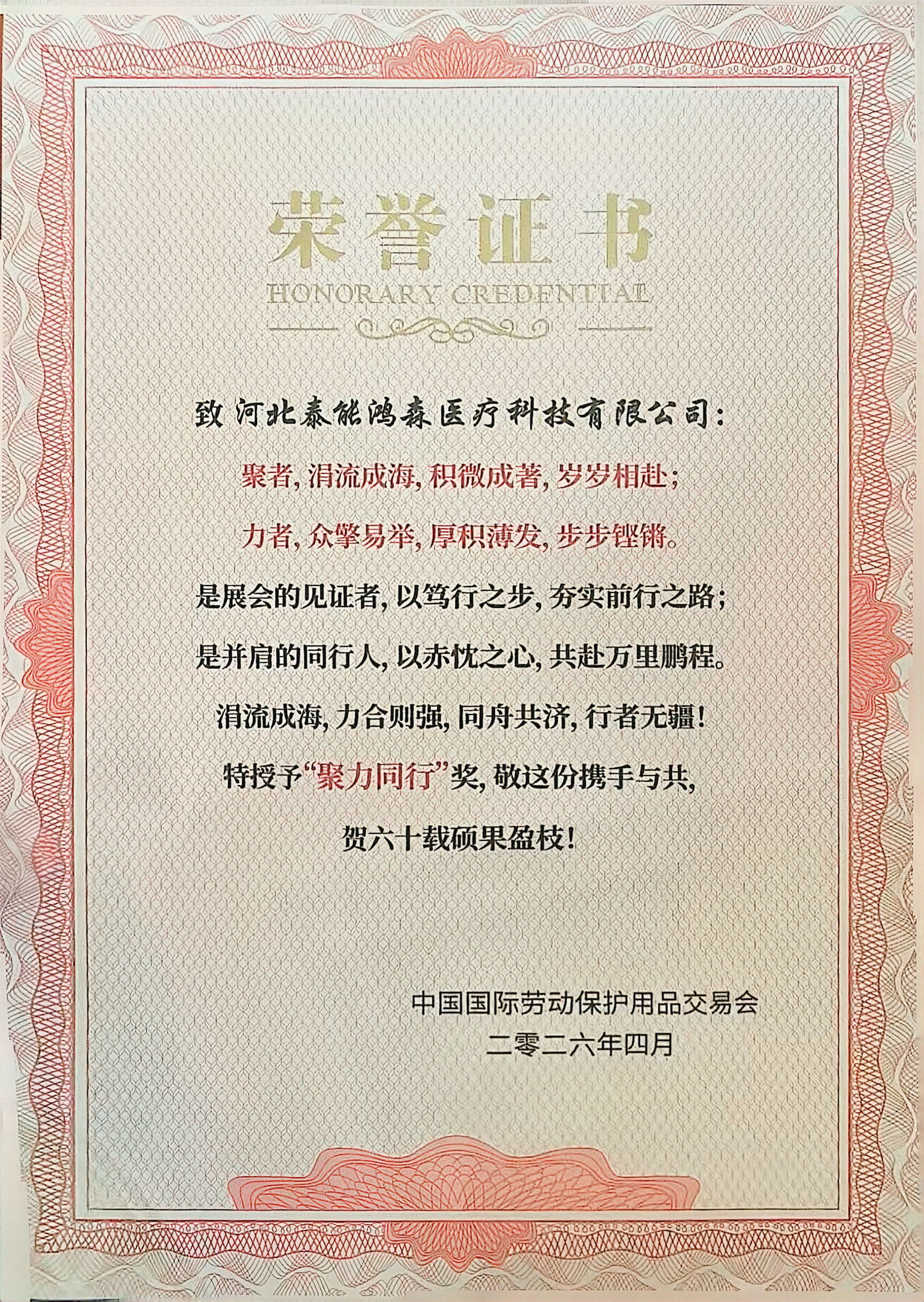 恰逢中国劳动保护用品交易会 60 周年,组委会为泰能医疗 & 添赞 Titanfine 颁发 “聚力同行” 奖,这是对企业长期深耕防护领域、坚持品质优先、推动行业协同发展的肯定。