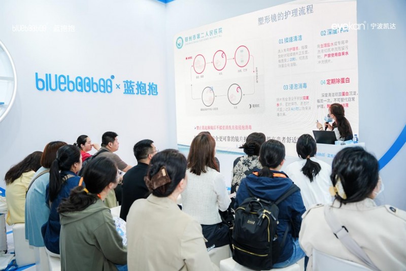 展会期间,多位眼视光专家亲临蓝抱抱展台,围绕OK镜护理学术新趋势、临床数据解读、家庭护理规范化等话题,带来了干货满满的分享。专家们从专业视角出发,深入浅出地讲解了镜片清洁对近视防控效果的影响,以及如何通过科学的日常护理延长镜片寿命、降低感染风险。现场听课互动气氛热烈,参观者们踊跃提问,专家们耐心解答,学术交流的火花在展台不断迸发。