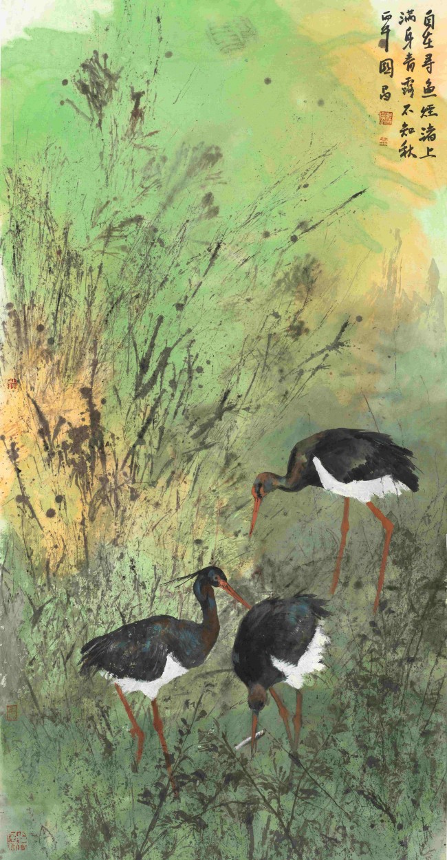 长久以来,中国花鸟画多以梅、兰、竹、菊及庭院禽鸟为核心题材,承载着深厚的文人隐喻。彭国昌却将画笔转向了广阔的“湿地”生态。他的画作中,白鹭、黑鹳等水鸟成为主角,它们栖息、觅食于芦苇丛生、水雾弥漫的自然场景,画面充满了湿润的空气感与生命的动态。这一题材的转变,并非简单的对象替换,而是将艺术视角从书斋内省,拉向了更具当代性的生态现场,使传统画科与“生态文明”的时代命题产生了直接关联。