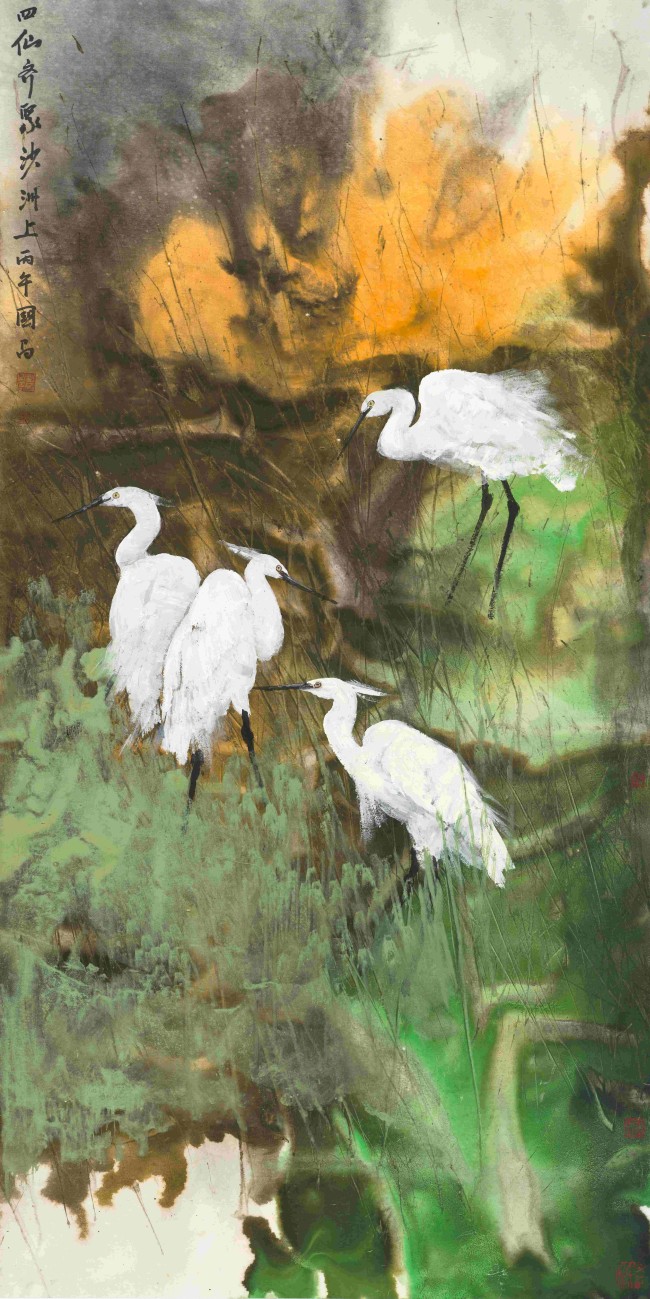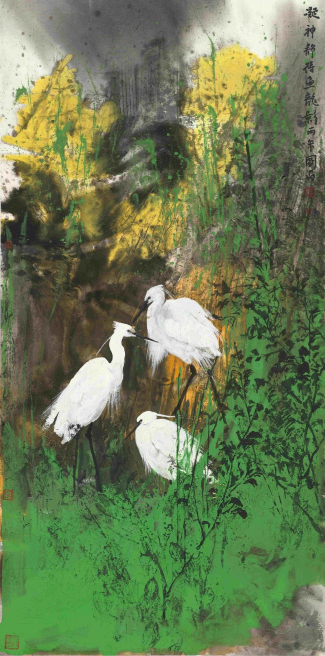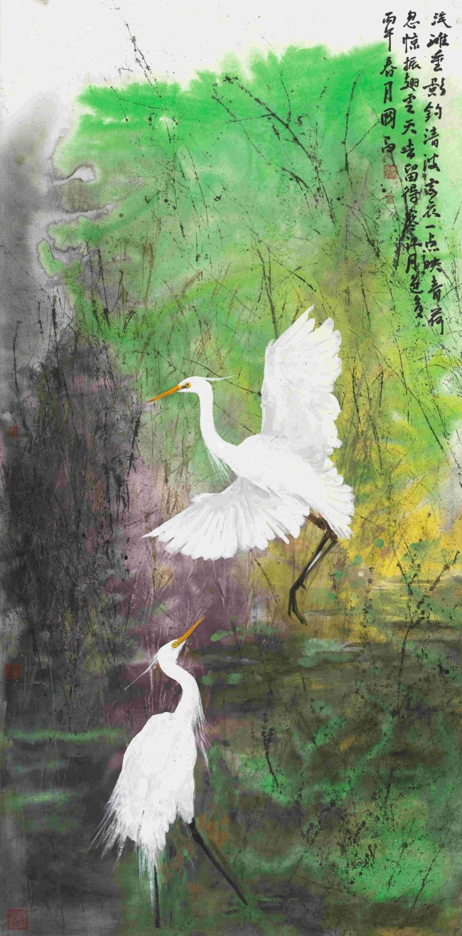 在艺术语言上,彭国昌进行了一场谨慎而大胆的实验。他坚守水墨写意的精神内核与书法用笔,同时显著强化了色彩的表现力。画面中常见白鹭的洁白与背景的赭石、青绿形成强烈对比,通过泼彩、晕染等手法,营造出抽象朦胧的远山与水天意境。这种“色墨交响”的手法,在保留传统笔墨韵味的基础上,注入了现代视觉的张力与情感强度,形成了独特的个人风格。