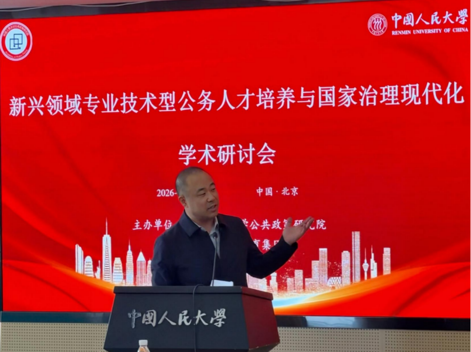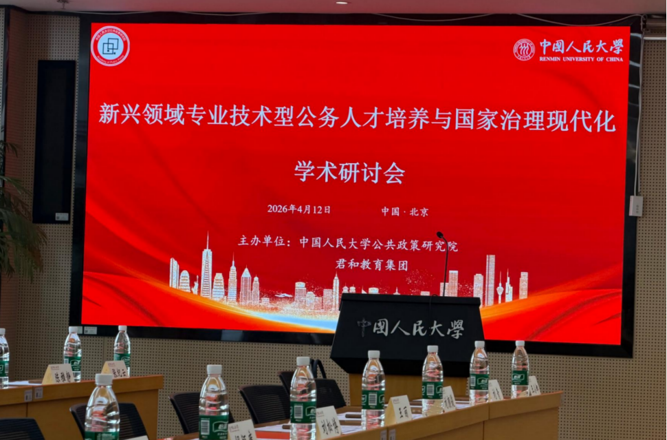 2026年4月12日下午,由中国人民大学公共政策研究院、君和教育集团联合主办的新兴领域专业型公务人才培养与国家治理现代化研讨会在中国人民大学立德楼隆重举行。来自国务院发展研究中心、中央党校(国家行政学院)、农业农村部、清华大学、北京大学、中国人民大学、北京航空航天大学、北京师范大学、中国人事科学研究院、中国行政管理学会、中国劳动关系学院、北京科技大学、天津科技大学、北京市科学技术研究院、山东省政府研究室、中共河北省委党校、天津市北辰区委组织部、人民日报社、中国青年报、中国社会科学报、人民论坛杂志社、中国经济体制改革杂志社等近50余位政产学研各界专家学者、实务工作者与业界代表齐聚一堂。紧扣新质生产力发展要求与 “十五五” 规划部署,聚焦为党育人、为国育才根本任务,深入研讨新兴领域专业技术型公务人才培育的战略意义、现实困境、国际经验与制度路径,为破解政府紧缺专业公务人才供给难题、提升国家治理现代化水平凝聚共识、贡献智慧。