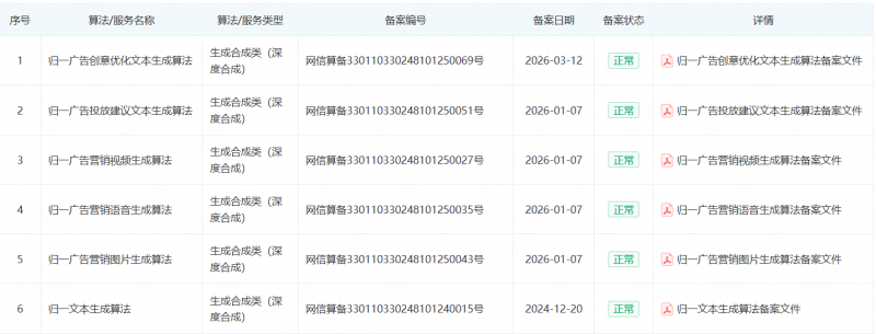 在技术合规层面,归一智能聚焦广告文案生成与广告数据分类两大领域,自主研发的关键技术方法已获国家专利授权。同时,针对图片、语音、视频、文案等核心场景自主研发的AI营销生成算法,均通过国家备案,标志着归一智能持续研发的一站式「AI营销超级产线」,拥有为客户提供高质量AI营销服务的合规基础。