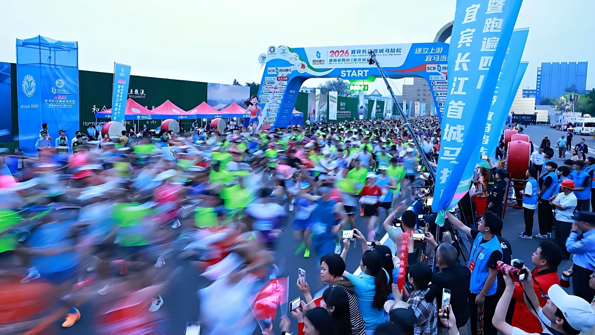 随着发令枪响,刹那间,参赛选手如开闸之水奔涌而出,从空中俯瞰,五彩斑斓的跑衣汇成一条流动的江河,沿着五粮液旗标广场向远方延伸,脚步声、呼吸声、加油声交织在一起,整座城市的心跳随之加速,那一刻,宜宾醒了,长江醒了,每一个奔跑的灵魂都迎着朝阳熠熠生辉。