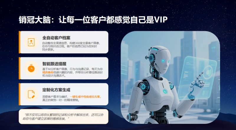 未来的销售团队,不是人海战术,而是精英与AI的组合,销冠大脑将与你一起从第一次与客户沟通到最后成交的全程陪伴。