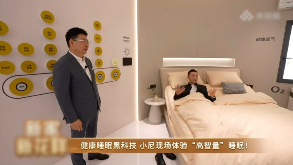 该方案通过灯光、音乐、温度、香氛等多维度环境协同调节,对睡眠节律进行科学干预,打造沉浸式睡眠体验。进入助眠模式后,灯光缓缓熄灭、音乐轻柔渐停,搭配慕思智能床的舒适支撑,全方位营造静谧舒缓的入眠环境,帮助用户快速放松、进入睡眠状态。体验过程中,尼格买提直言:“好舒服,感觉像是在摇篮里哄我睡觉。”