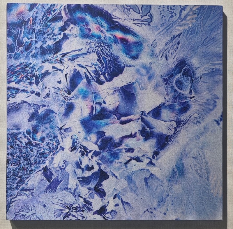 展出的作品形式多样、构思巧妙,其中四幅尤为引人注目:《水韵诗境》印于真丝之上,以显微摄影展现流水的纹理之美,引人遐想时光与流水交织的意境;一幅描绘青西郊野公园的作品,水杉倒映清溪,空灵静谧;《双禽相嬉》同样印于真丝,并辅以苏绣技艺,翠鸟振翅、双禽相戏的姿态灵动翩跹,自然生机呼之欲出。