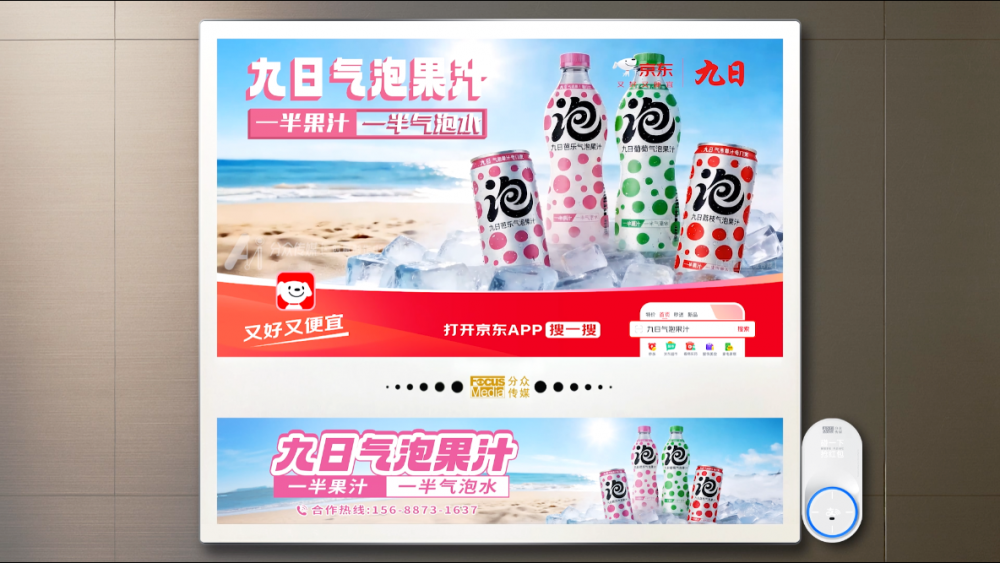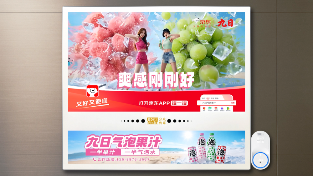 当下饮品市场竞争白热化,品牌心智争夺成为决胜关键。九日气泡果汁精准选择与分众传媒携手,依托其覆盖河南全省的数十万部电梯智能屏资源,深度渗透城市主流消费人群的生活轨迹。封闭、高频、低干扰的电梯场景,让“比汽水更健康,比果汁更清爽”的核心卖点实现强记忆、深渗透,快速在中原消费者心中建立清晰的品牌认知。