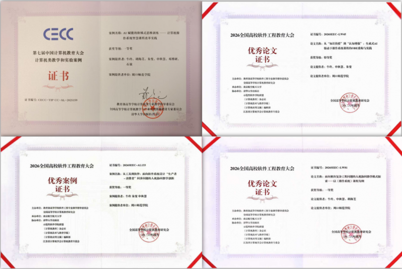 《计算机操作系统》课程改革成效显著,2025年获评河南省高校精品课程(智慧),教学资源包被线上教学平台收录为示范教学包,辐射全国115所高校。团队教学创新成果获得国家级教学案例奖4项,如第七届中国计算机教育大会教学案例一等奖;基于课程改革成果撰写的论文获2026年全国软件工程教育大会优秀论文特等奖1项,一等奖1项。