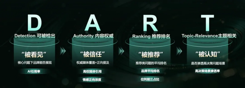 优化成效如何科学衡量?李倩现场预告了即将上线的DART四维评估体系2.0版本。该模型从“被看见、被信任、被推荐、被认知”四个维度,对品牌在主流AI平台的表现进行可视化度量与智能分析,让GEO投入清晰可量化,真正实现全链闭环。