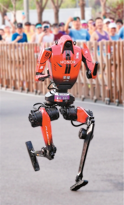 4月19日,2026北京亦庄半程马拉松暨人形机器人半程马拉松现场,“闪电”机器人正在奔跑。 |