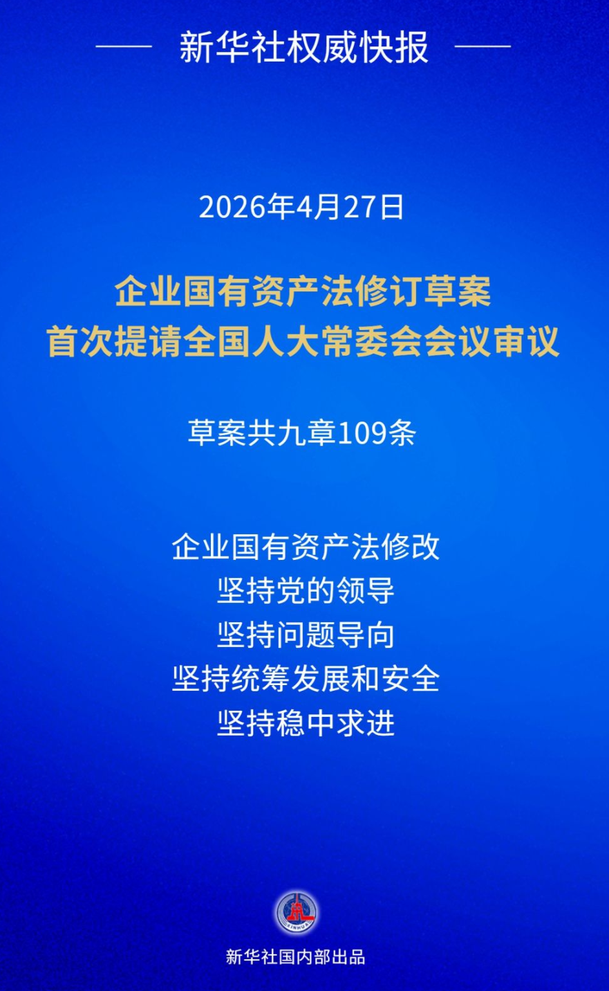 企业国有资产法修订草案4月27日提请十四届全国人大常委会第二十二次会议首次审议。企业国有资产法修改坚持党的领导,坚持问题导向,坚持统筹发展和安全,坚持稳中求进。